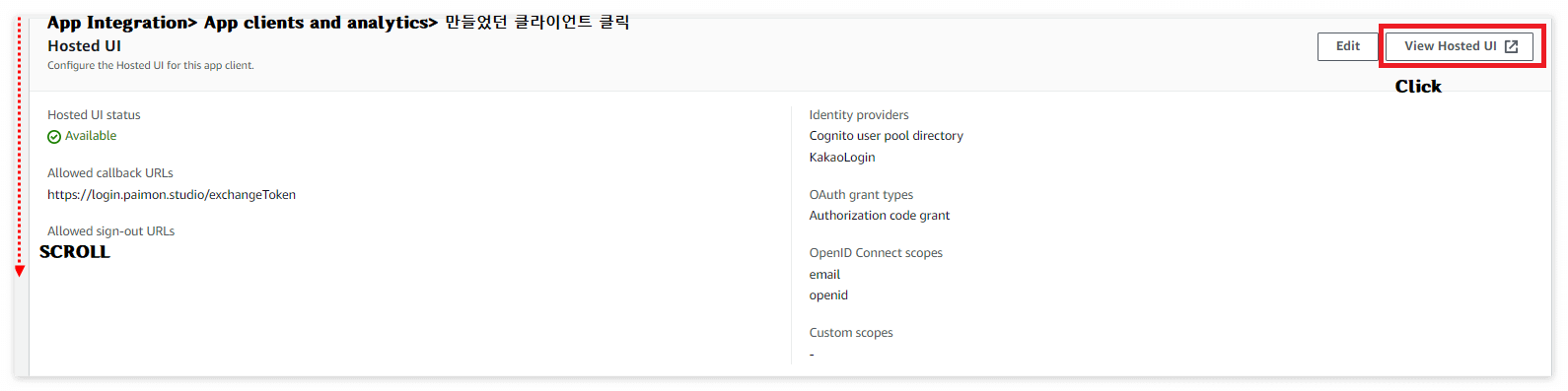 App Integration> App clients and analytics로 가서 아까 만들었던 클라이언트를 클릭해 줘. 스크롤을 조금 내리면 Hosted UI가 있어. 얘의 수정 화면으로 진입한 다음 카카오 로그인을 신분 제공자로 추가해 주렴.