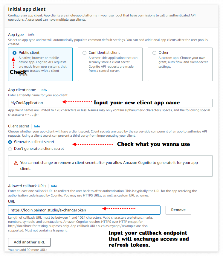 그림과 같이 Client 앱을 CUP에 등록했어. 콜백 엔드포인트 등록을 하라는데, 이 엔드포인트는 우리 앱과 Cognito 사이의 OAuth2 혹은 OIDC 플로우를 지원하는 백엔드와 연결되어야 해. 지금 당장은 바르게 동작하지 않아도 괜찮아.