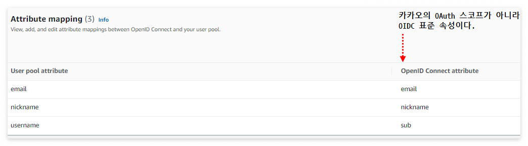 - 카카오 로그인의 OIDC가 내려주는 속성과, 우리 유저 풀의 속성을 매핑한다.